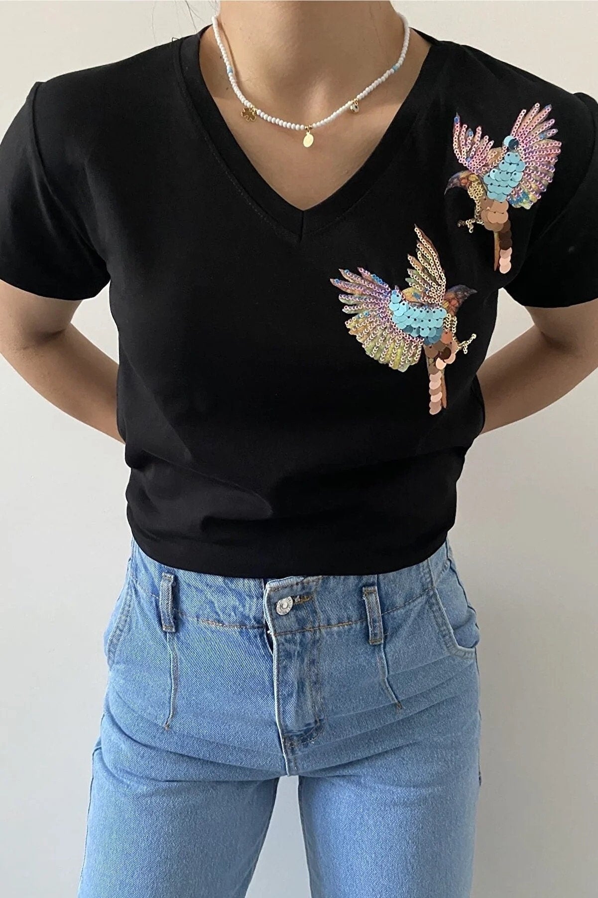 Embrace a casual chic look with our Bird Embroidered Tee, a piece that's as perfect for a beach getaway as it is for urban adventures. Add this enchanting top to your collection and let your style shine!