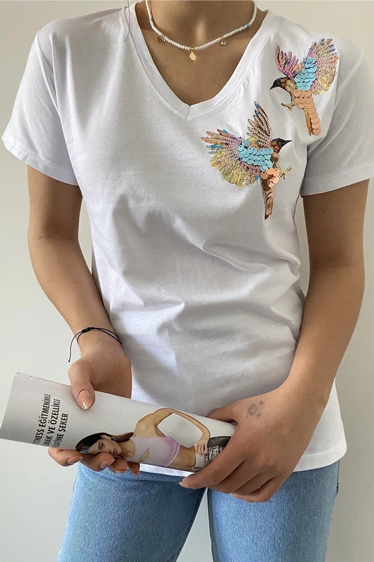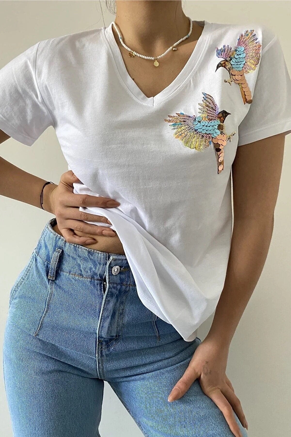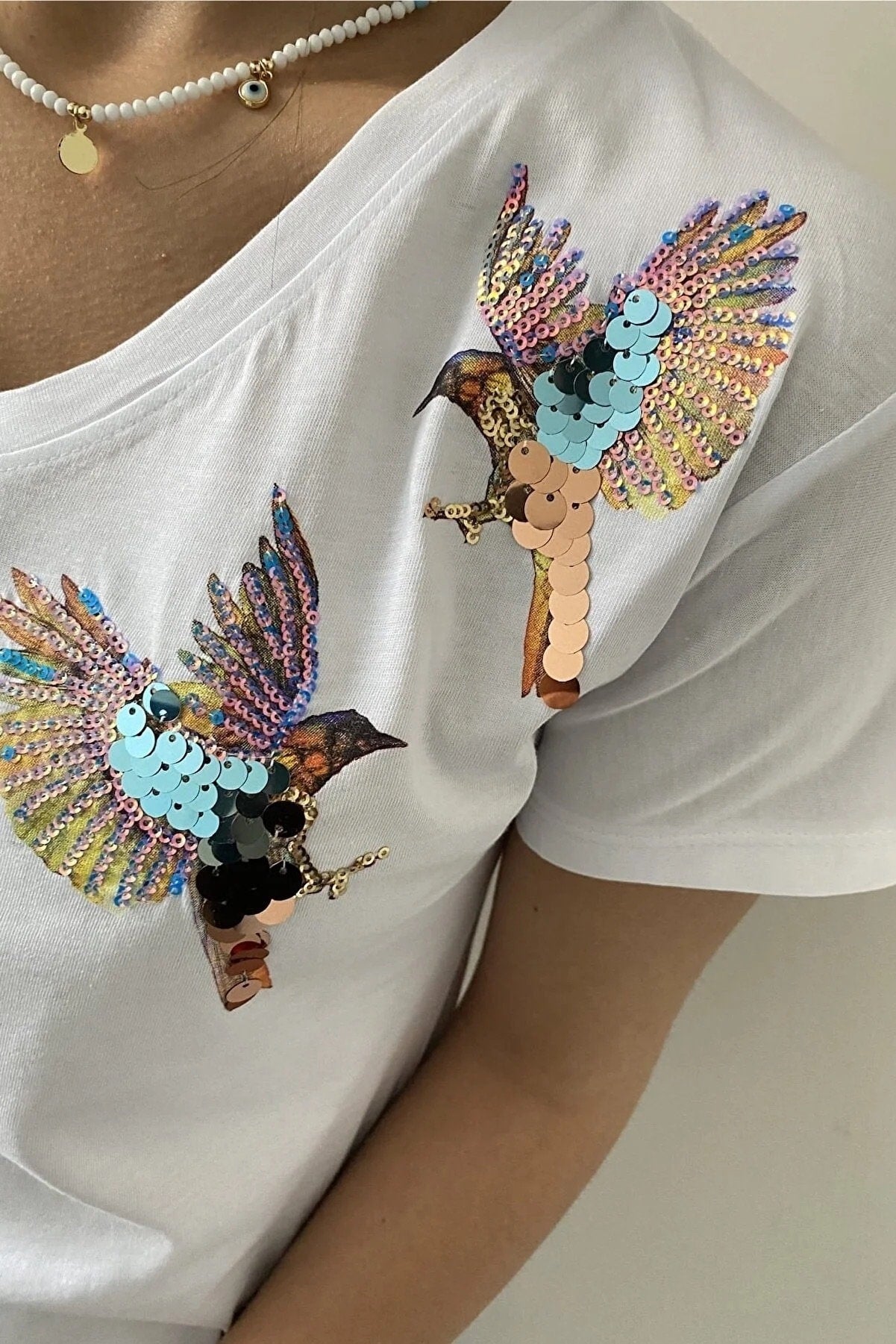 Embrace a casual chic look with our Bird Embroidered Tee, a piece that's as perfect for a beach getaway as it is for urban adventures. Add this enchanting top to your collection and let your style shine!