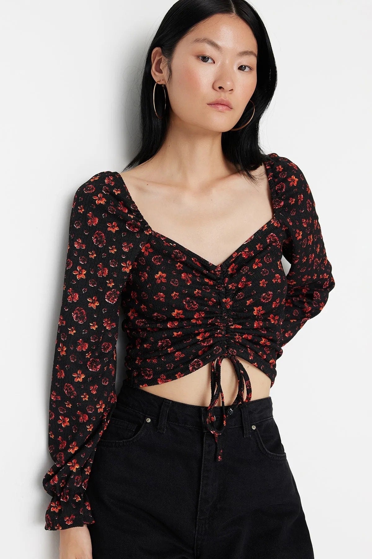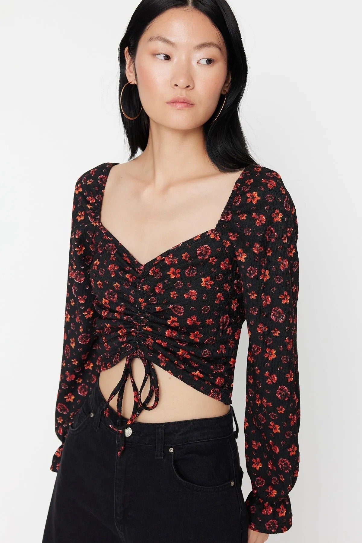 Black Floral Print Balloon Sleeve Heart Collar Blouse