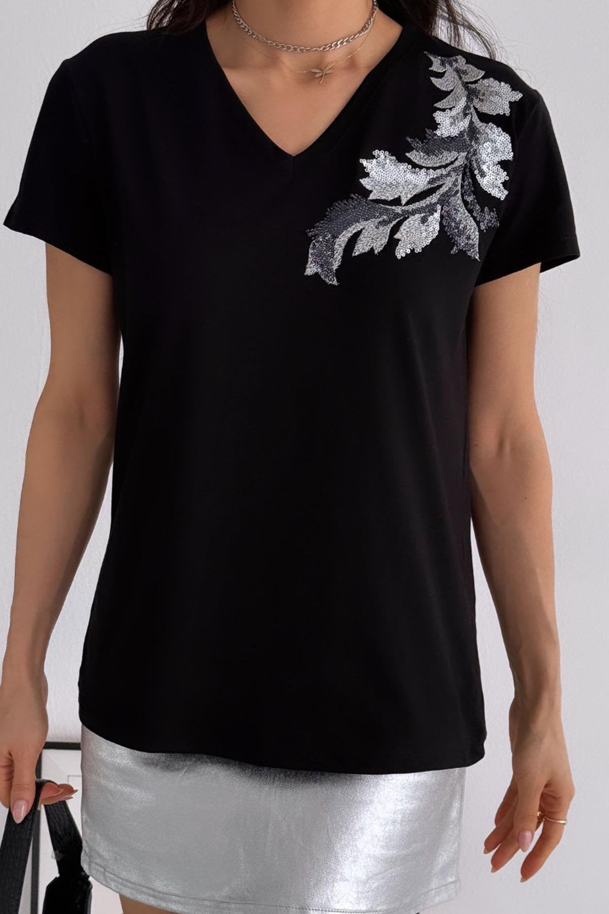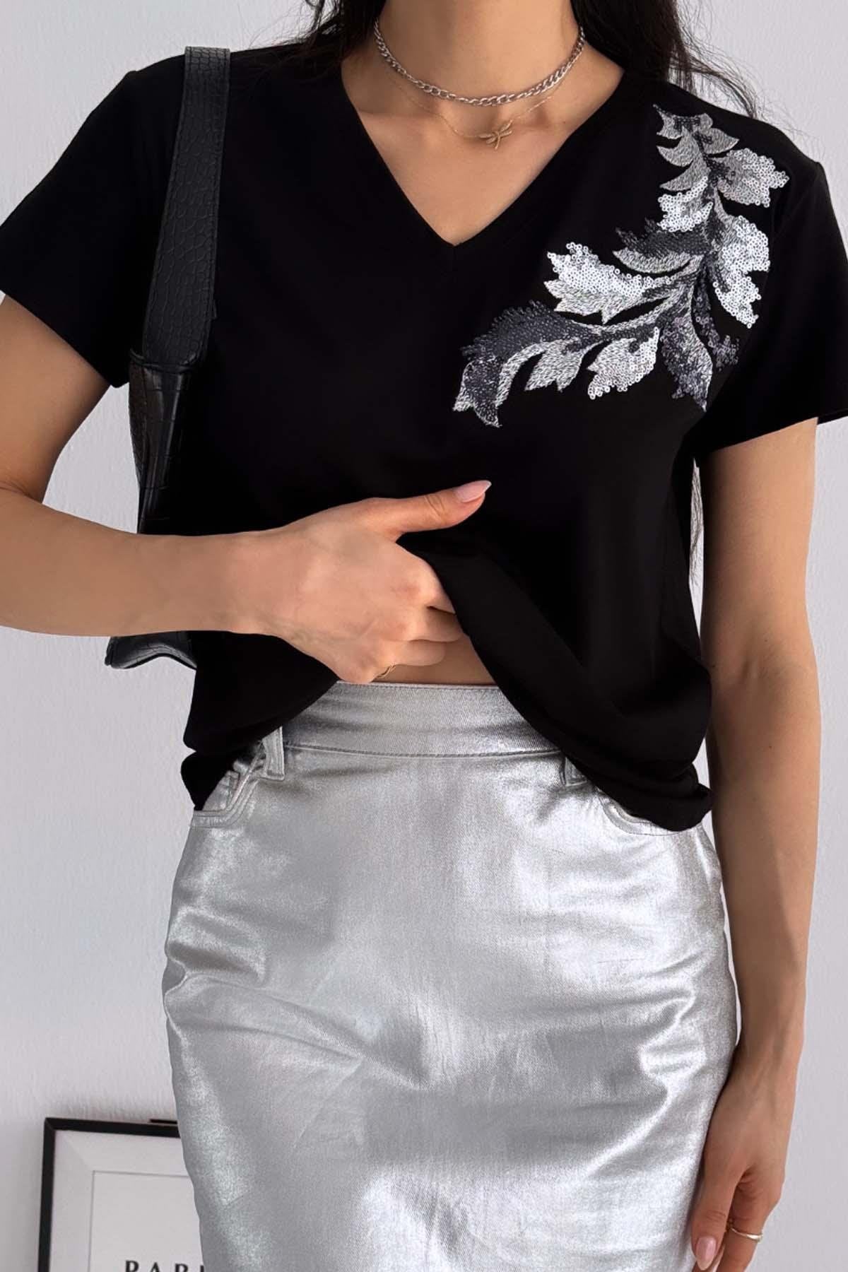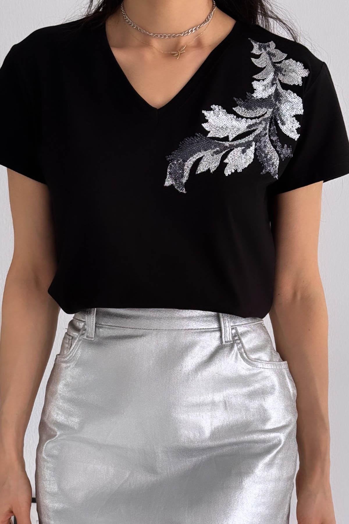 Tilda Black V-Neck T-Shirt with Silver Sequin Leaf Embellishment