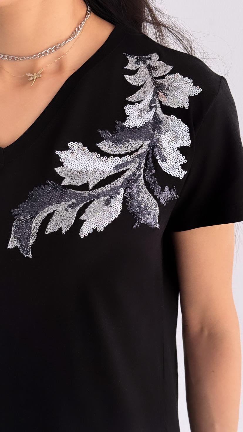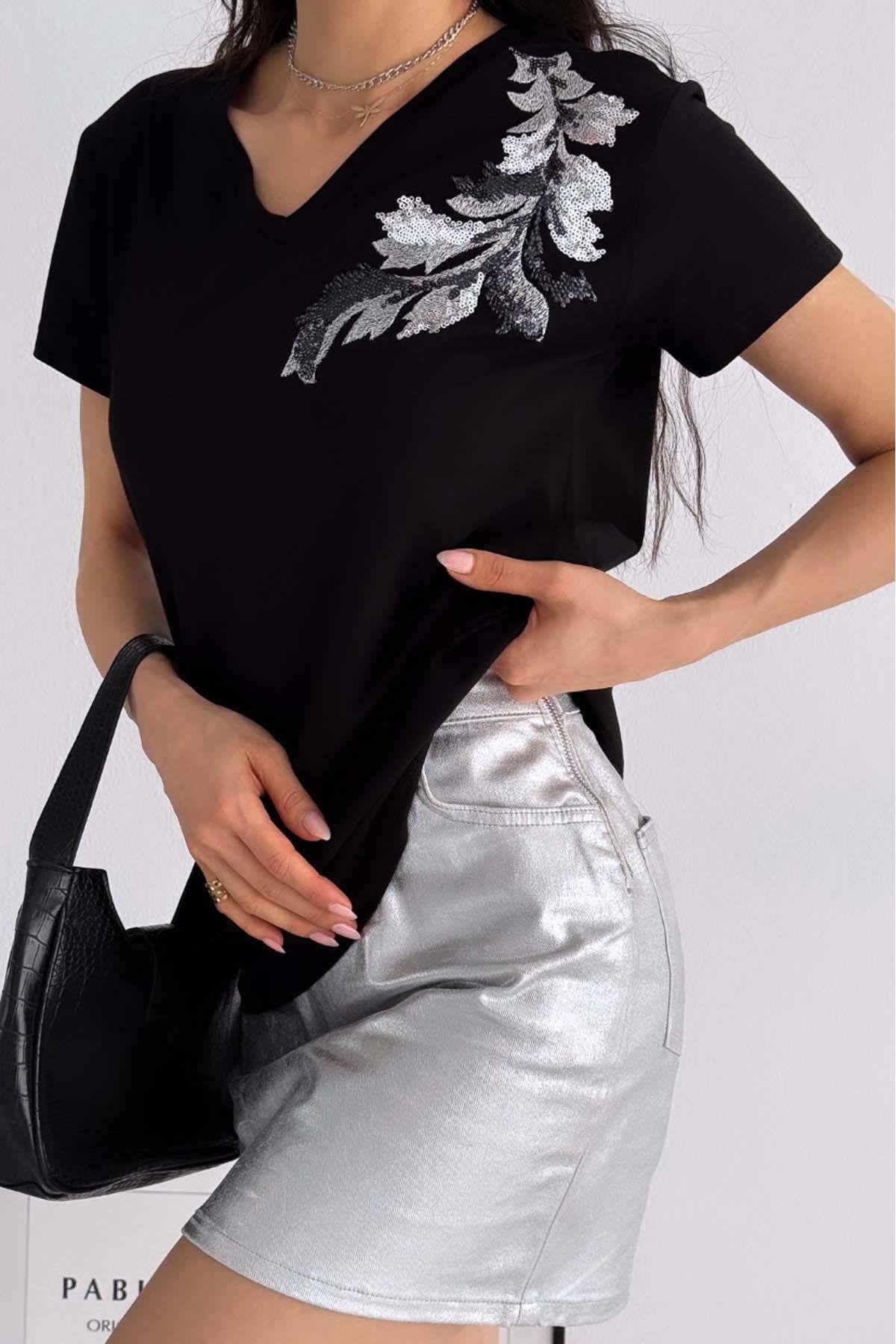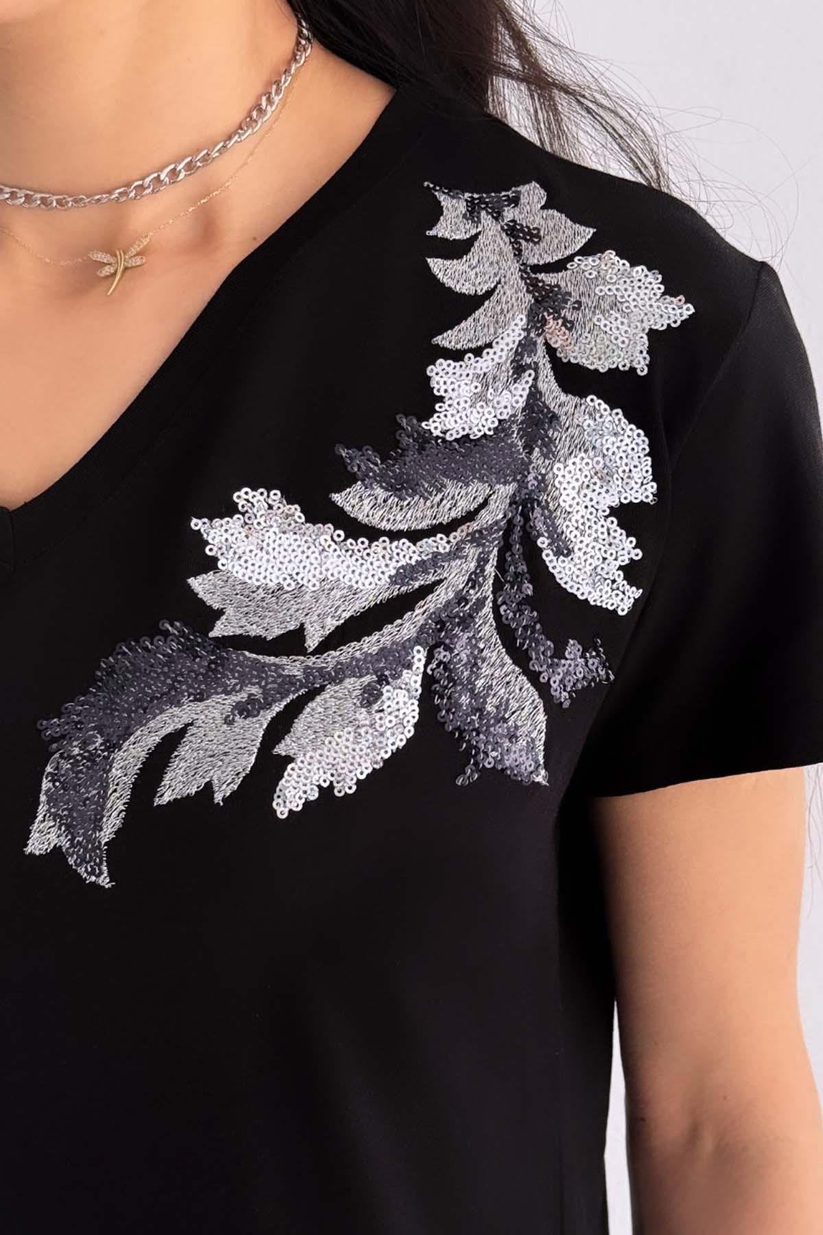 Tilda Black V-Neck T-Shirt with Silver Sequin Leaf Embellishment