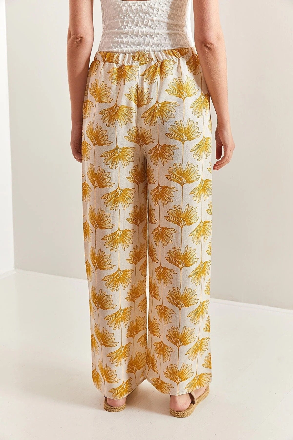 "Yellow Gingko Print Wide Leg Linen Pants"