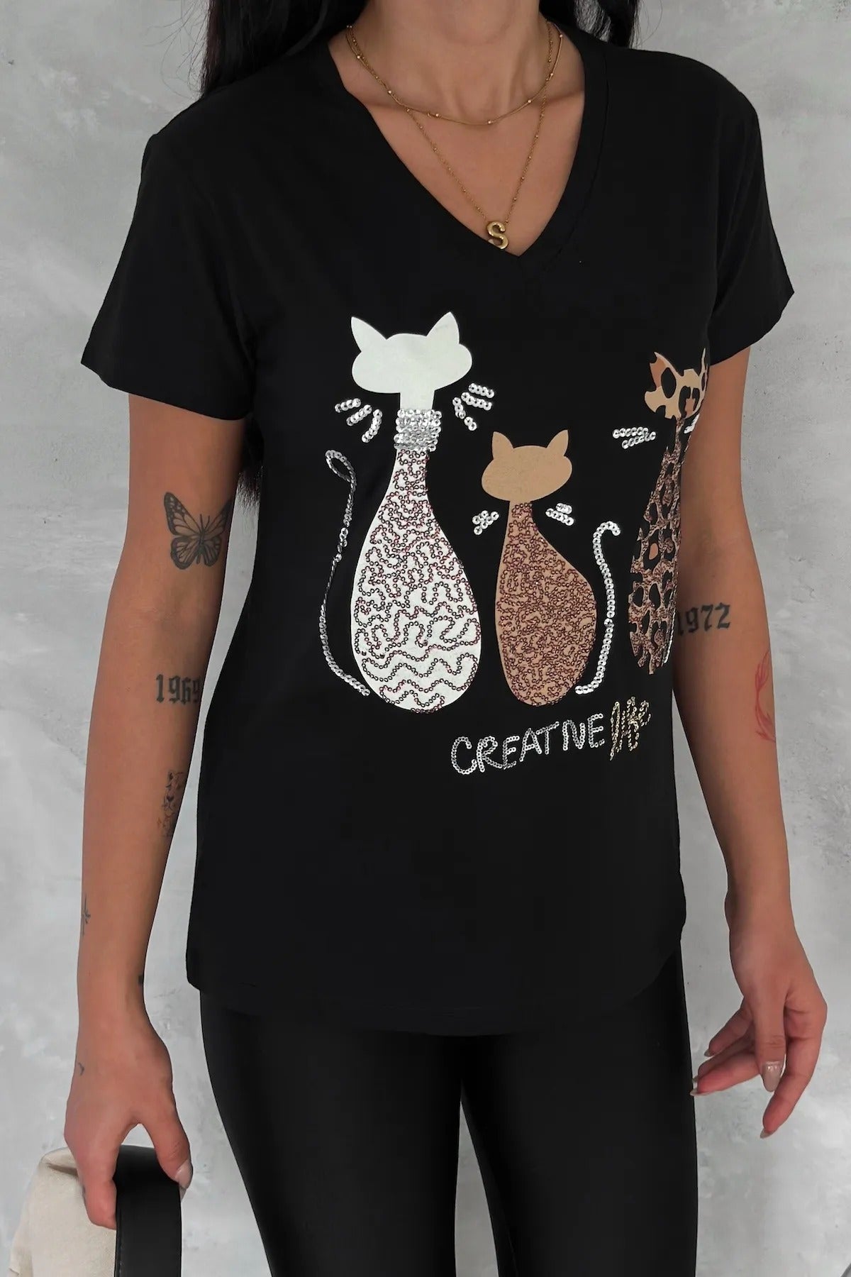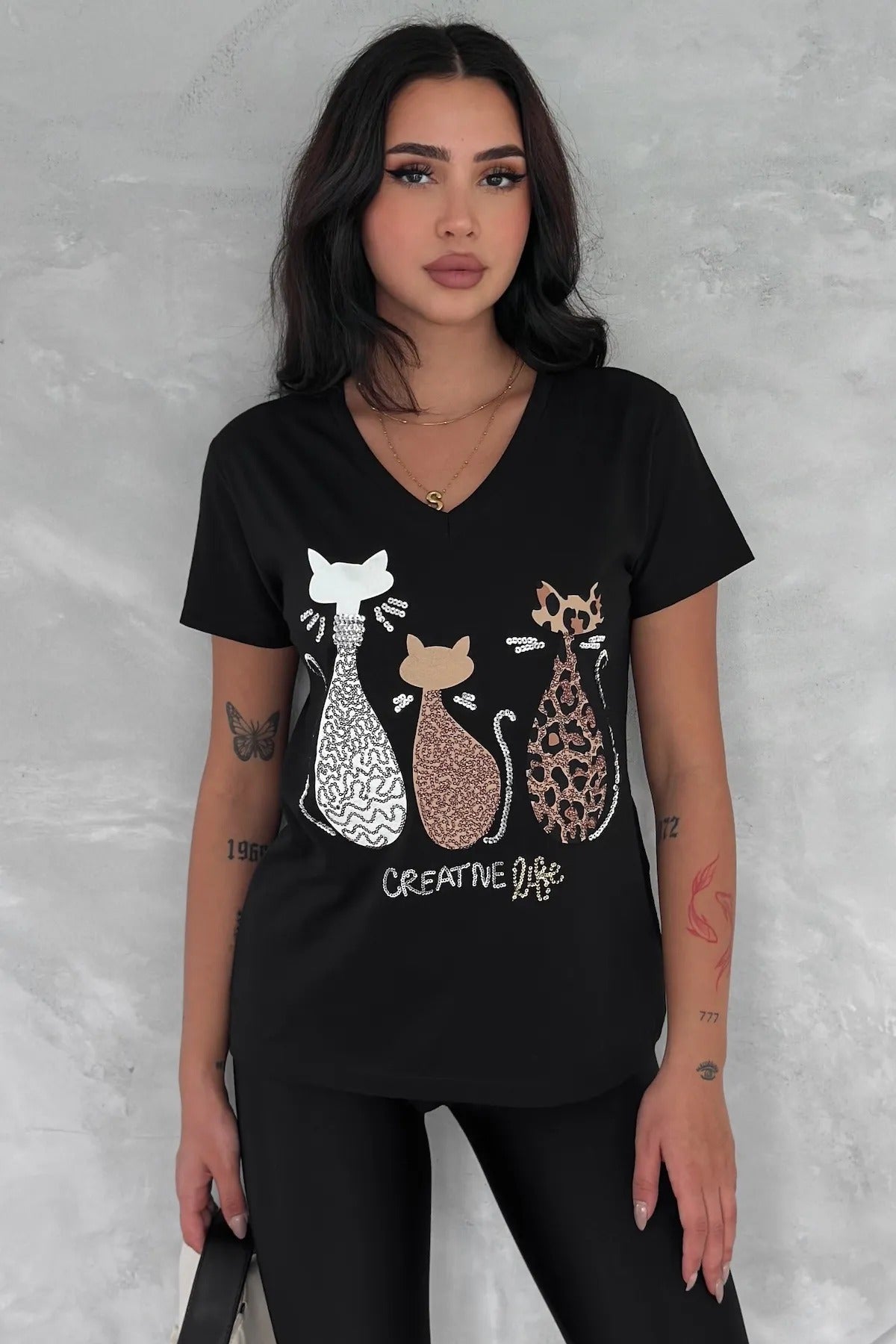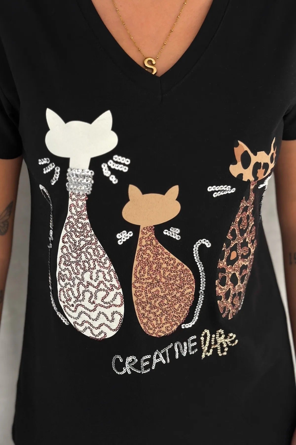 Tilda Cat Sequin Cotton Short Sleeve T-Shirt - Black