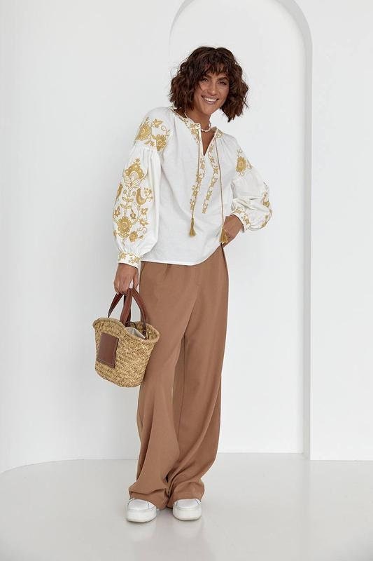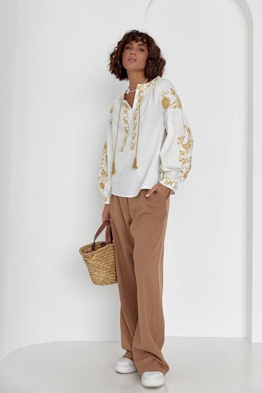 Ecru Gold Bird Floral Embroidered Cotton Blouse