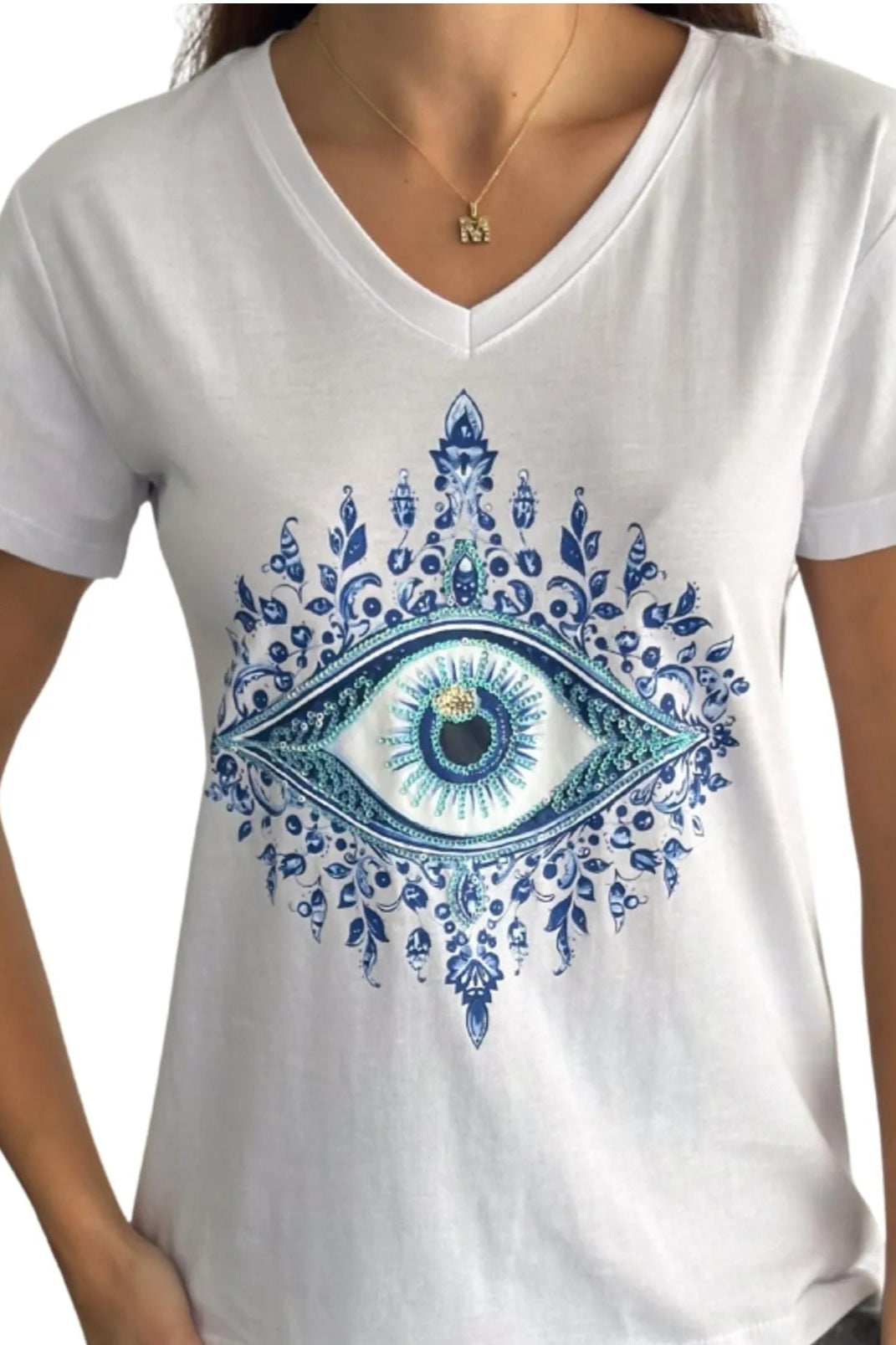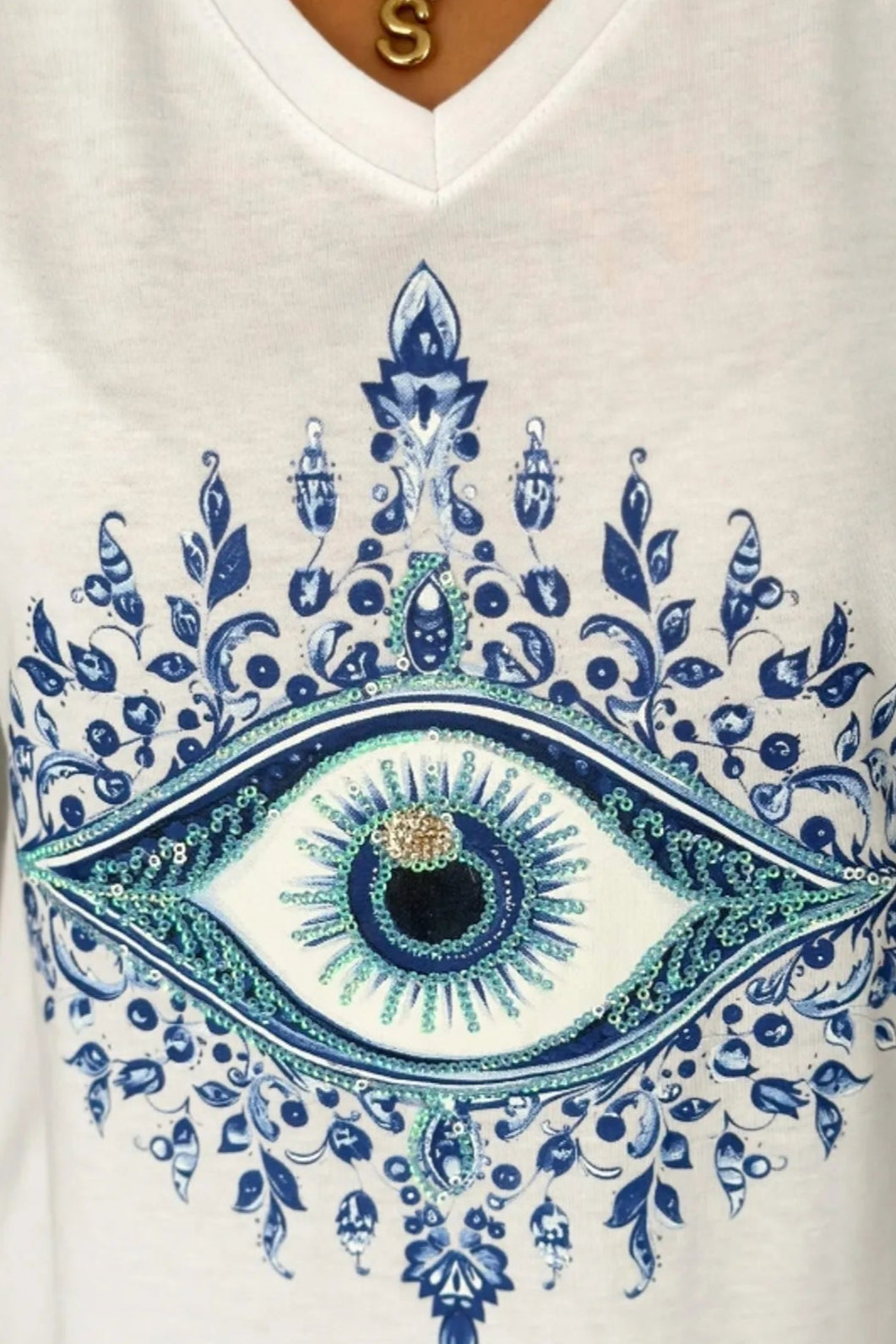 Description: Catch the eye and capture the essence of seaside glamour with our White Evil Eye T-Shirt. This 100% cotton t-shirt is a treasure trove of style, featuring a dazzling sequined eye design that brings a touch of the ocean's shimmer to your everyday look.