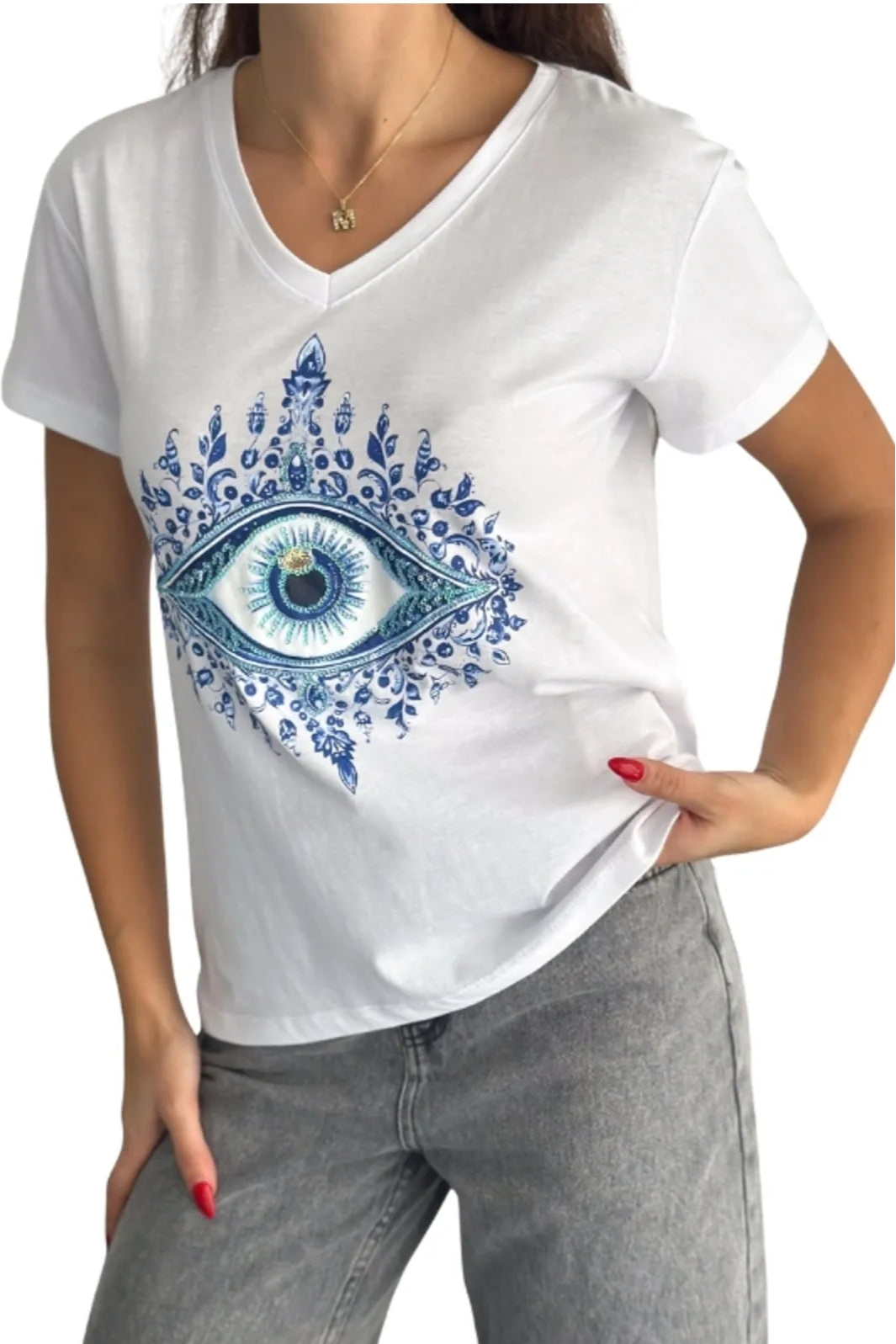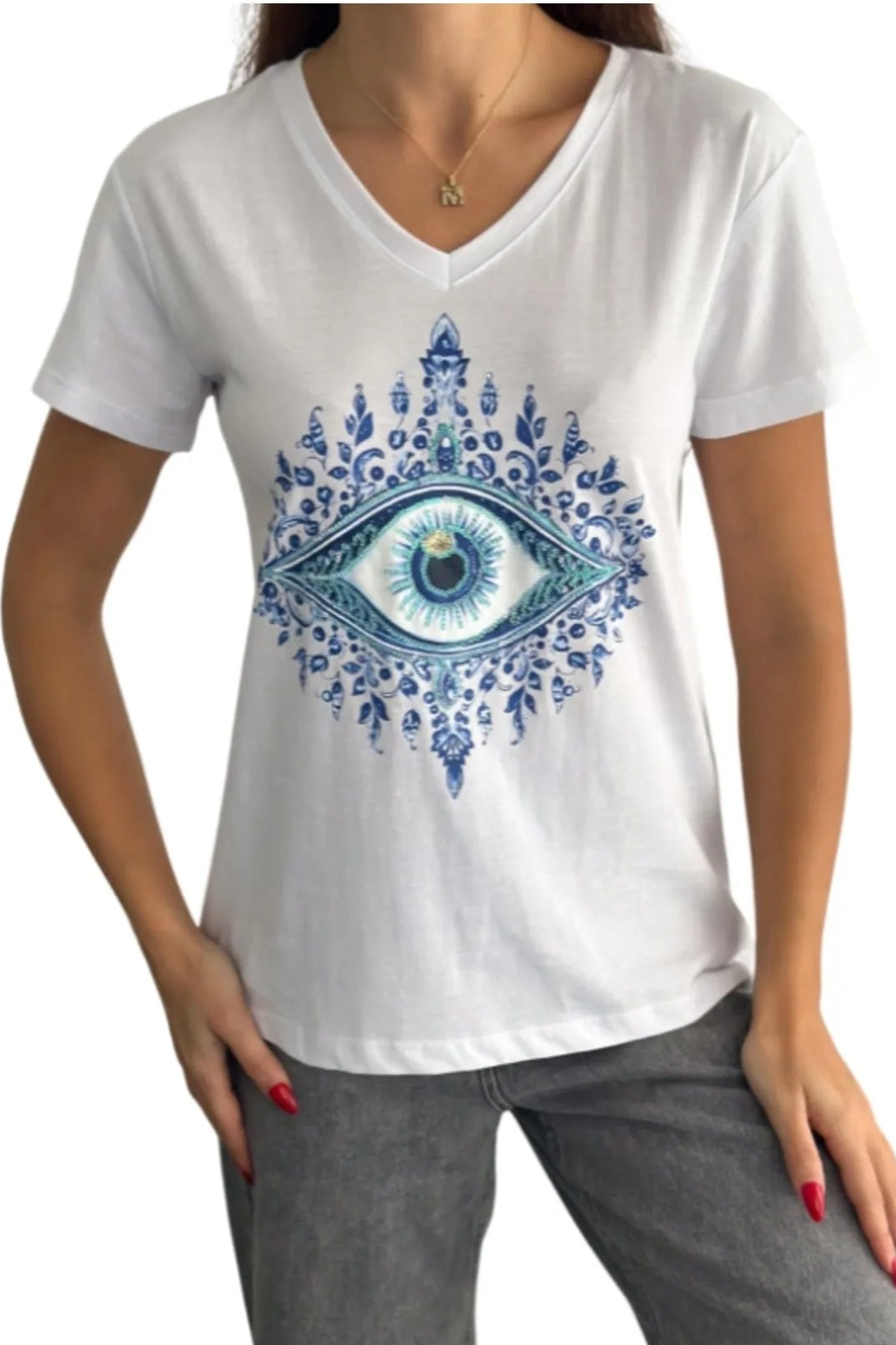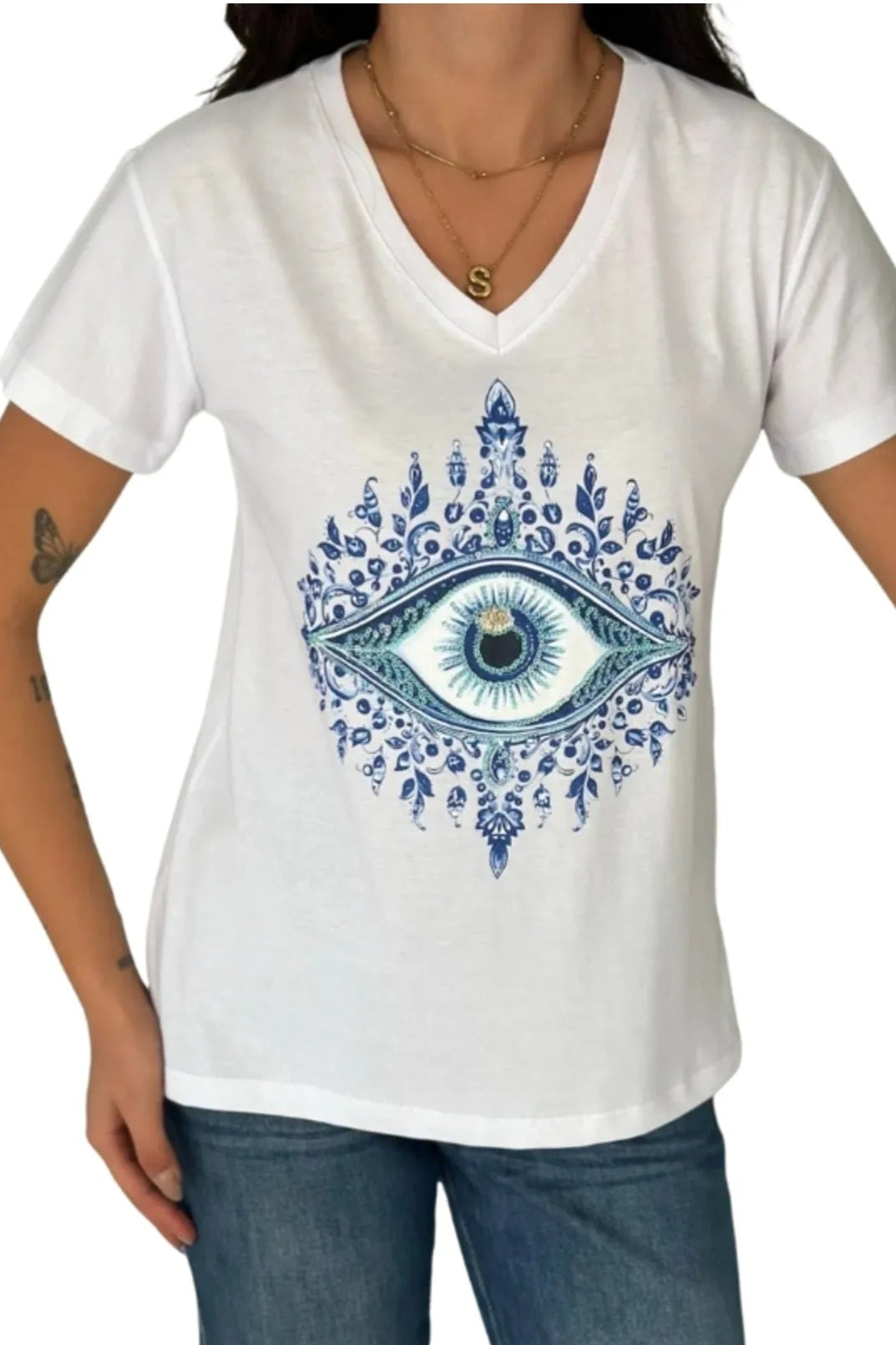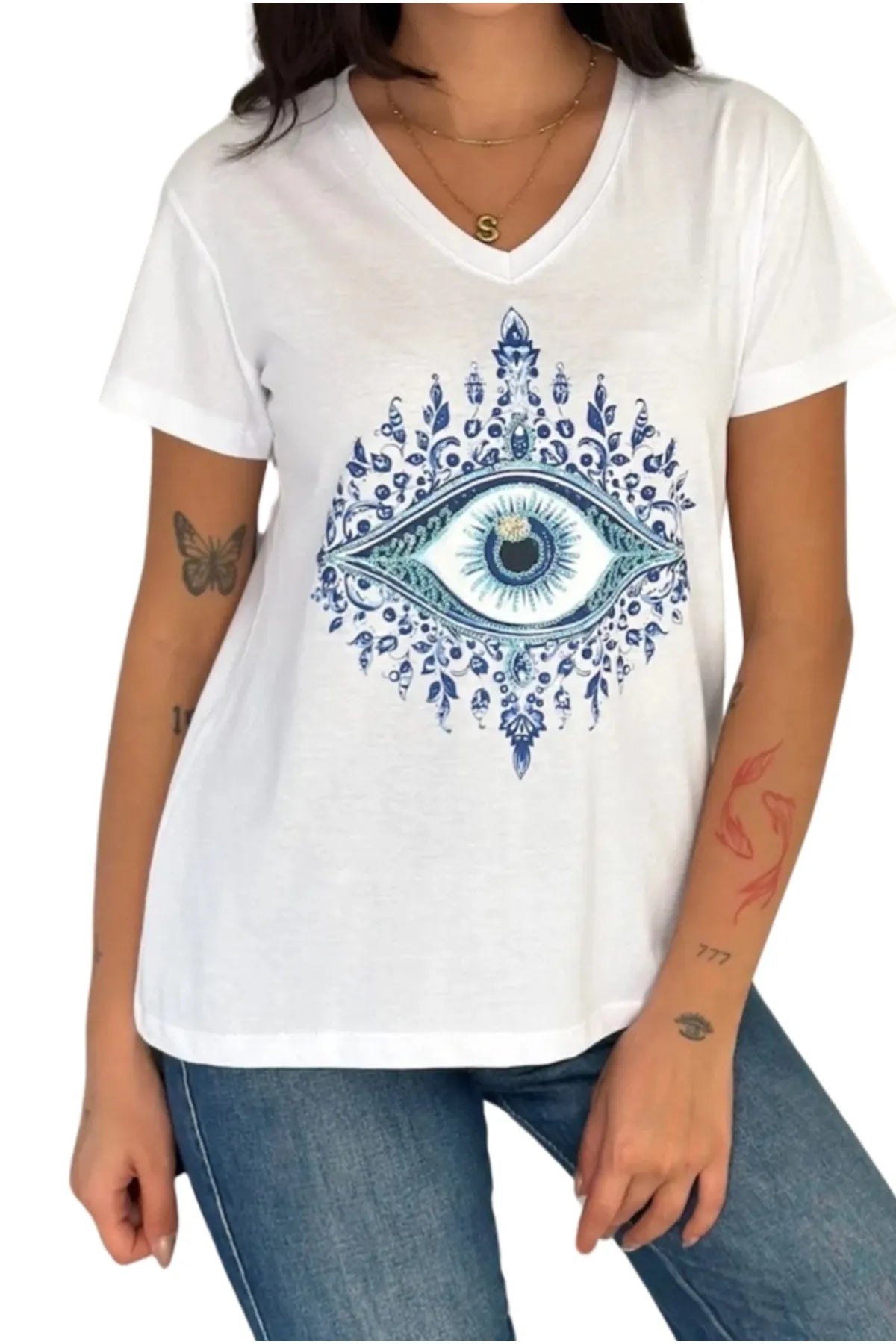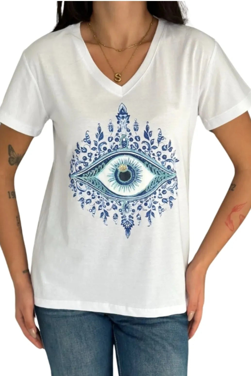 Embrace a casual chic look with our White Evil Eye T-Shirt, a piece that's as perfect for a beach getaway as it is for urban adventures. Add this enchanting top to your collection and let your style shine!