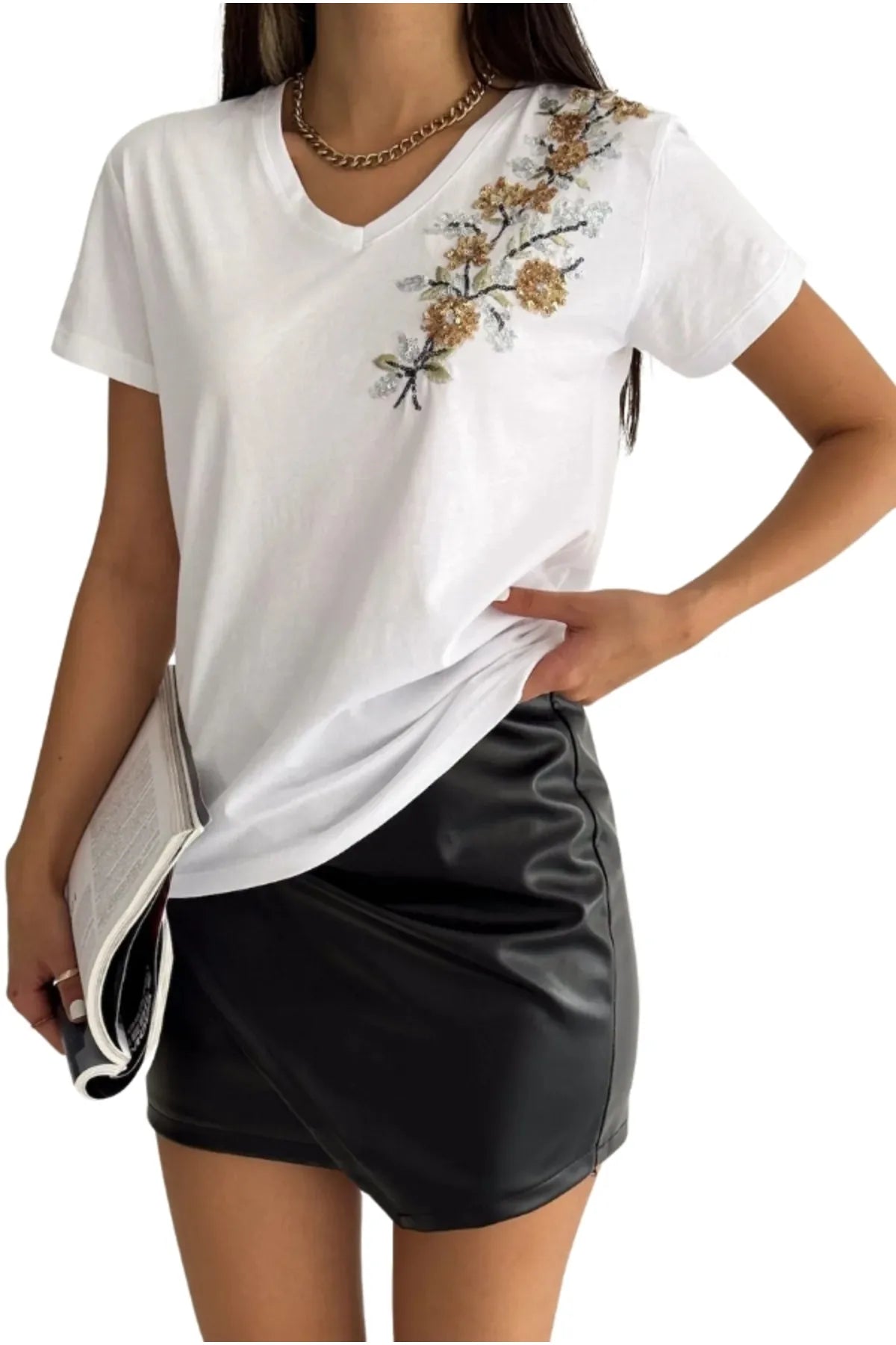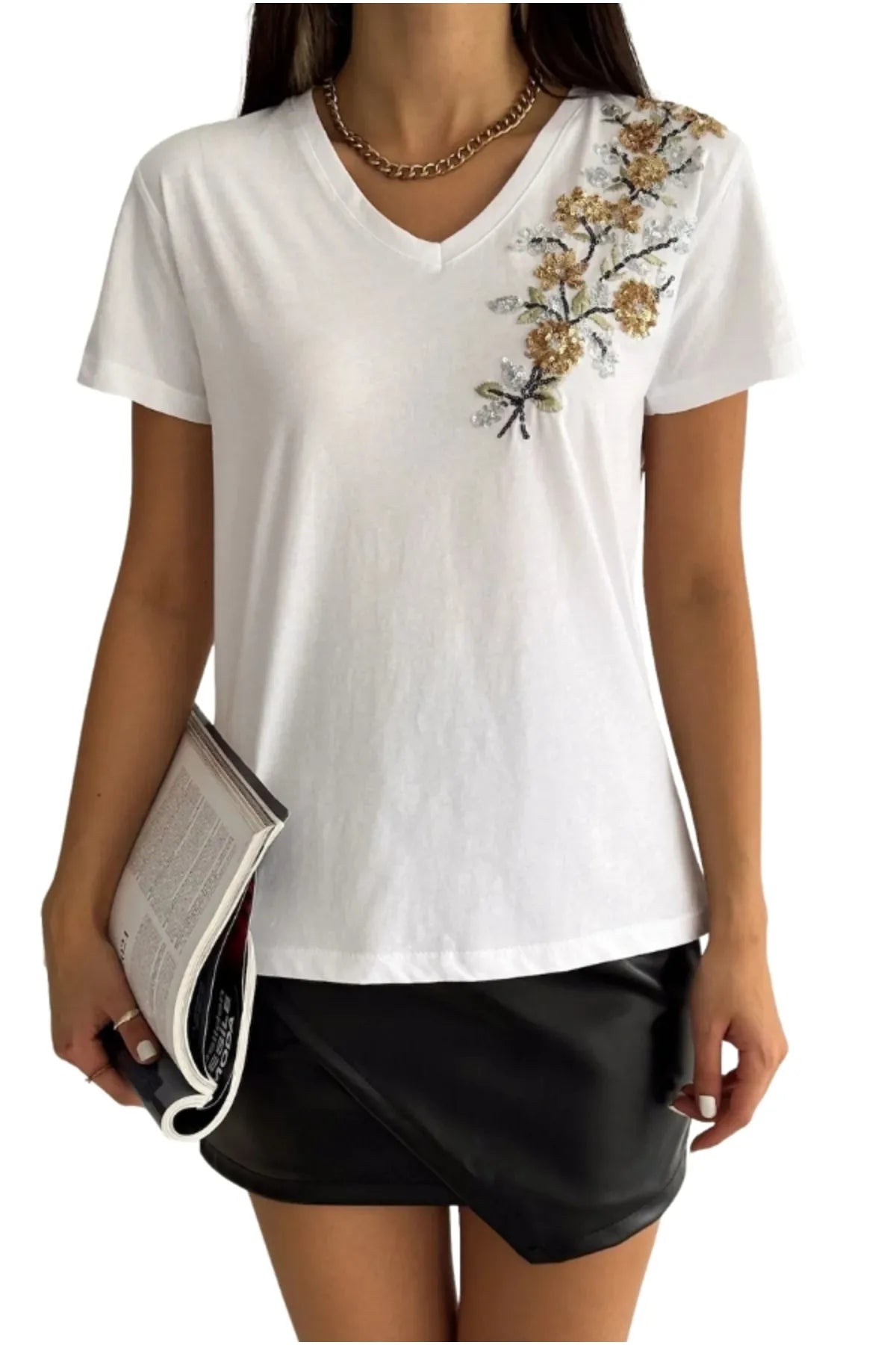 Embrace a casual chic look with our Gold Floral Embroidered T-shirt, a piece that's as perfect for a beach getaway as it is for urban adventures. Add this enchanting top to your collection and let your style shine!