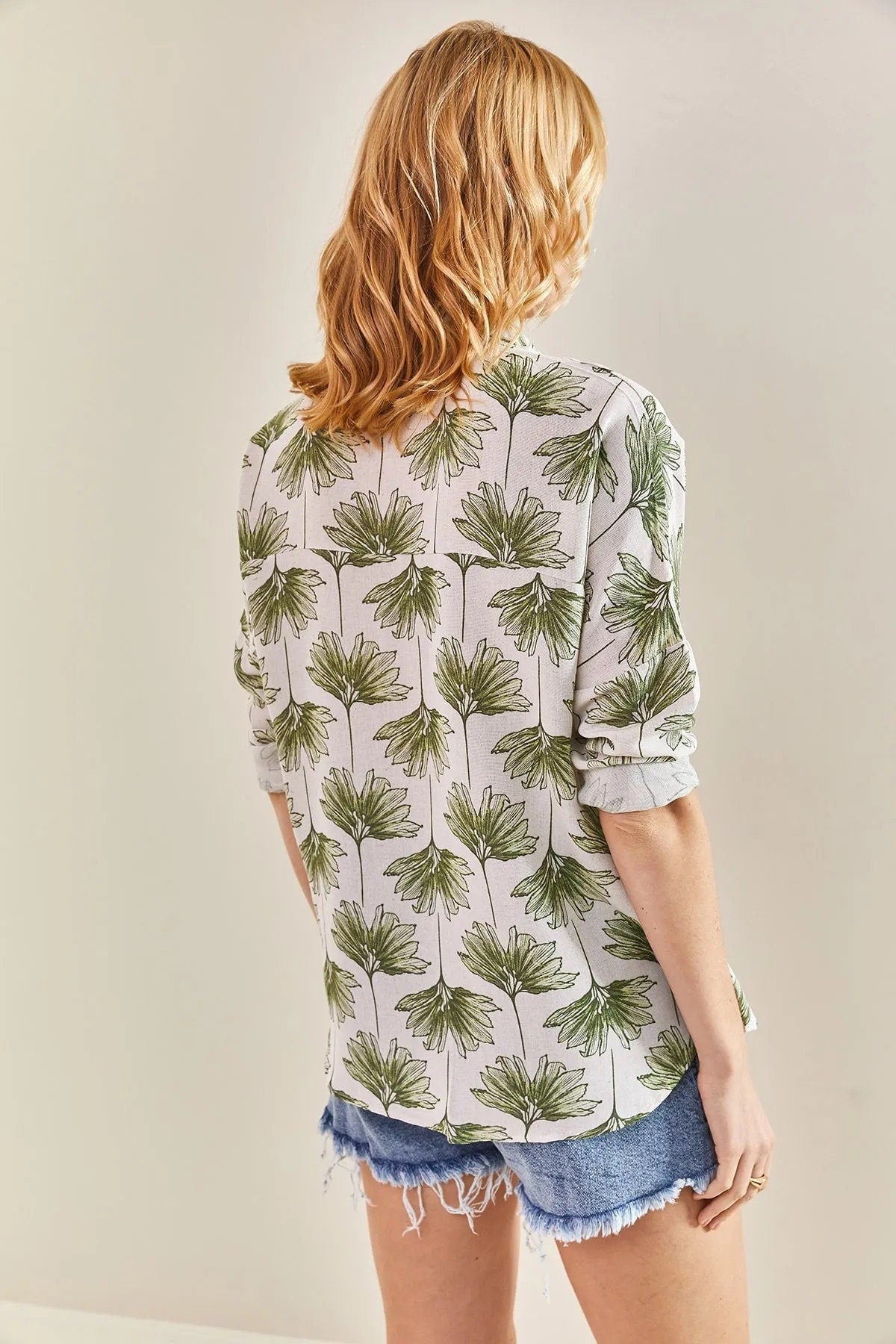 Description: Dive into the vibrant essence of summer with our Green Gingko Print Linen Blend Blouse. Draped in the luxuriance of the gingko designer print transport you to an endless summer.