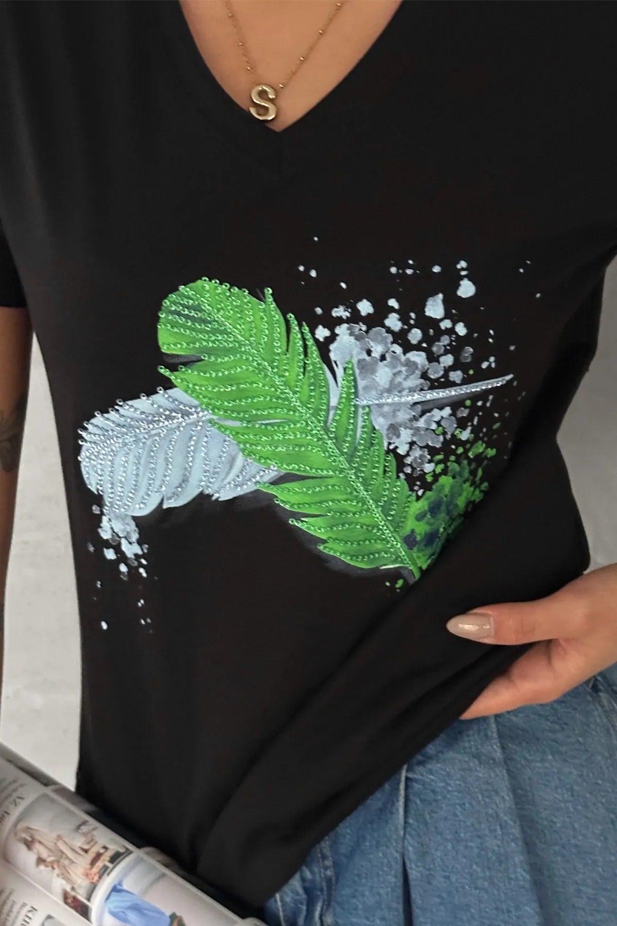 Tilda Leaf Sequin Cotton Short Sleeve T-Shirt - Black