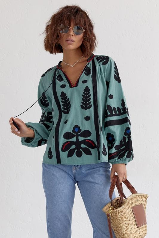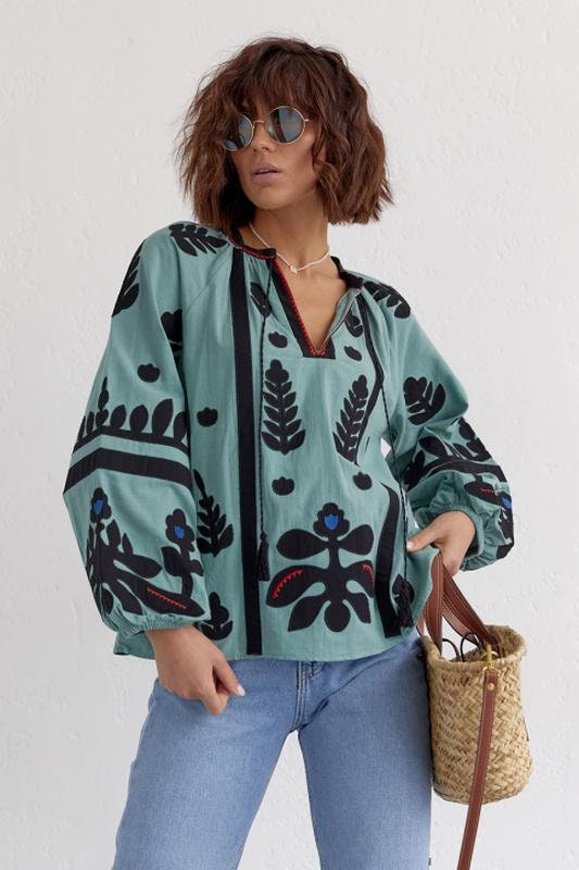 Mint Green Ethnic Embroidered Cotton Vyshyvanka