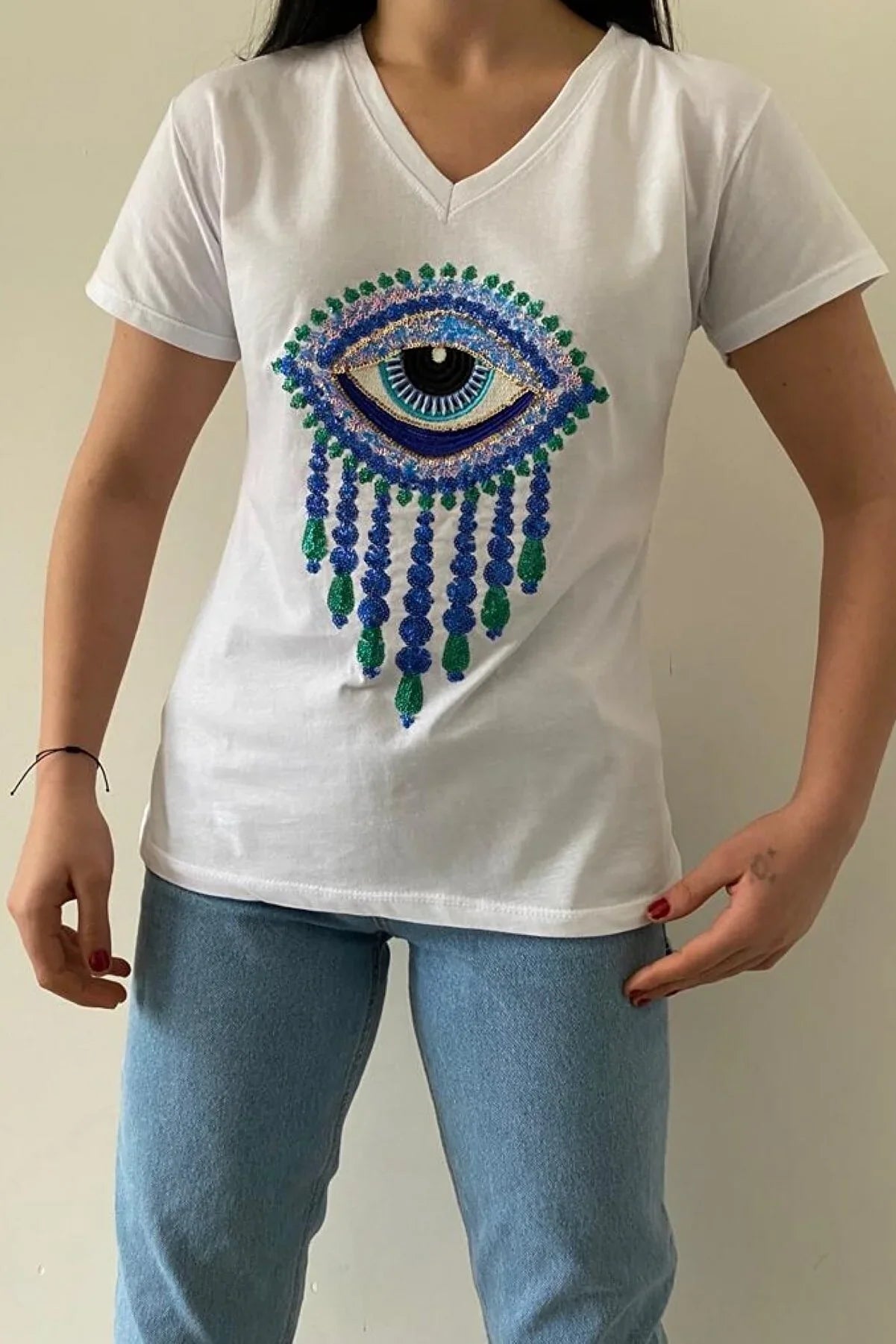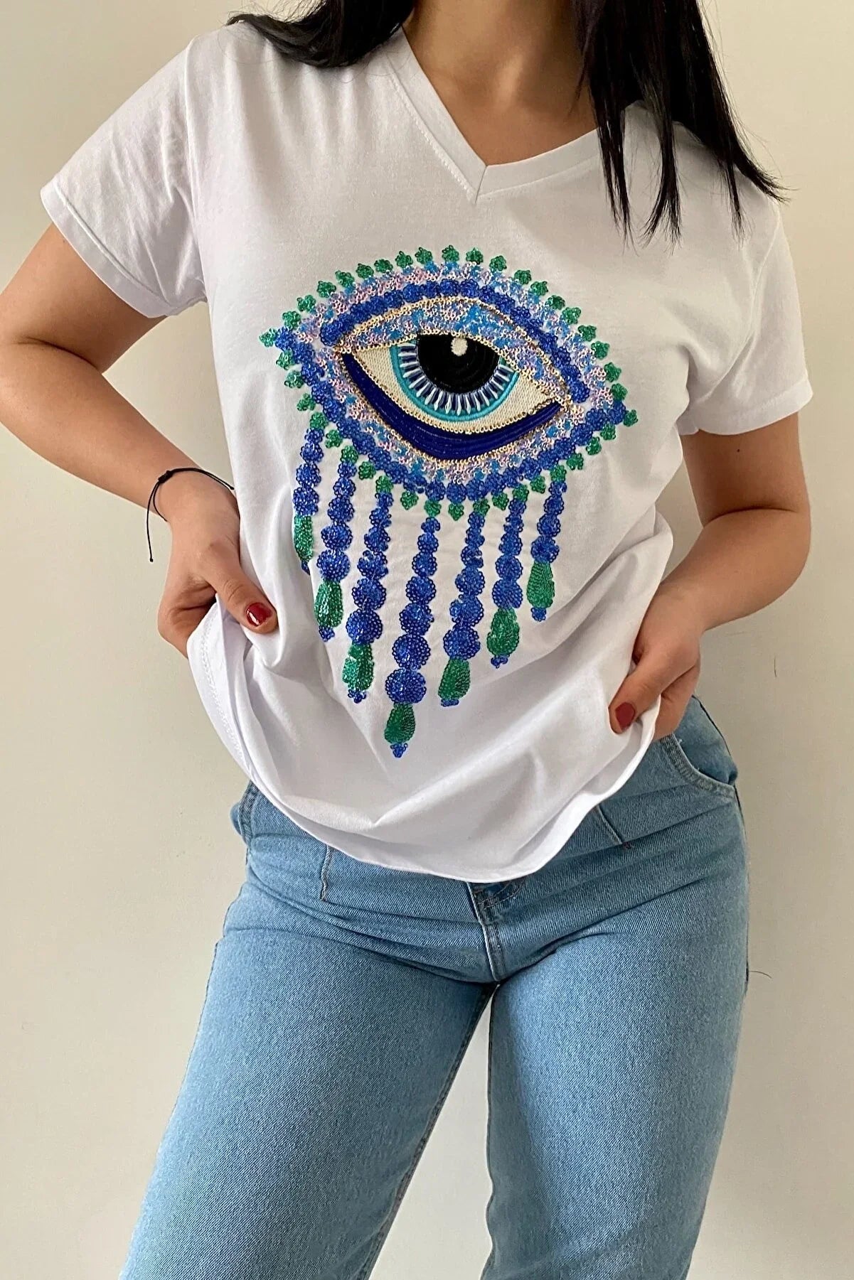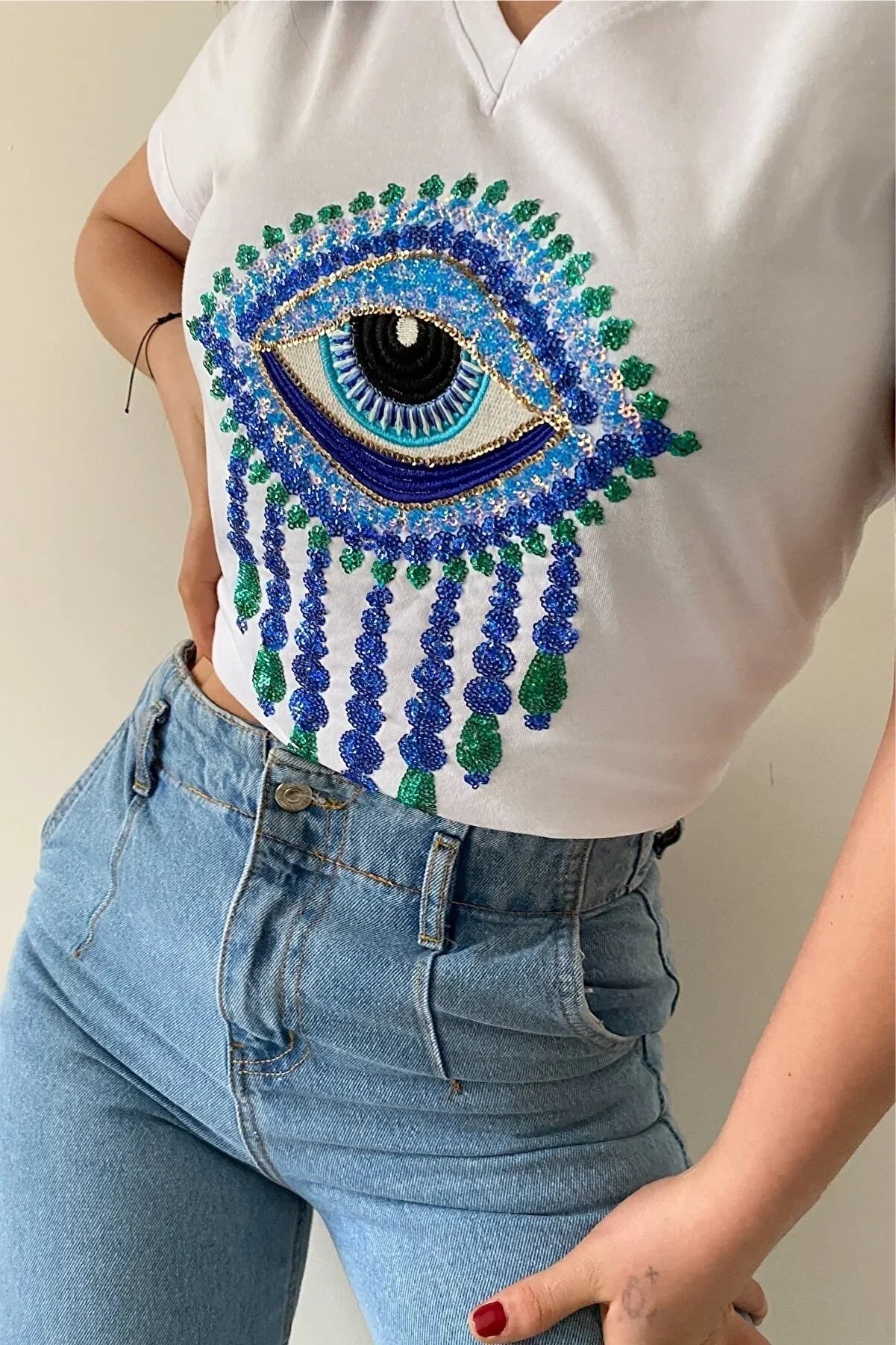 Description: Catch the eye and capture the essence of seaside glamour with our White Evil Eye T-Shirt. This 100% cotton t-shirt is a treasure trove of style, featuring a dazzling sequined eye design that brings a touch of the ocean's shimmer to your everyday look.